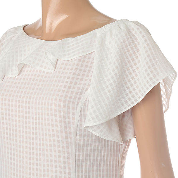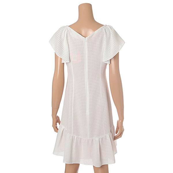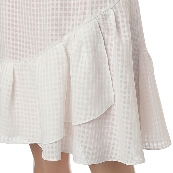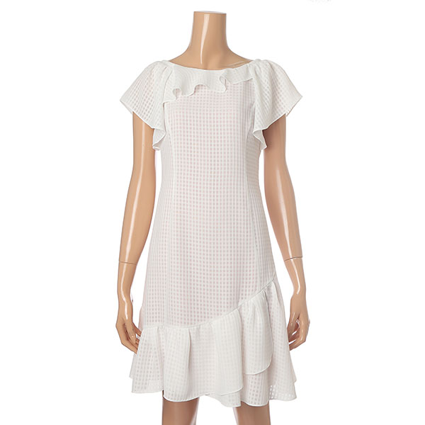하늘하늘하게 떨어지는 어깨와 스커트 밑단의 언발 러플 디테일이 돋보이는 원피스입니다.
