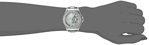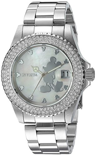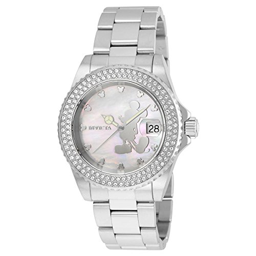 Invicta 22727 Disney Limited Edition women's dive watch features a 40mm wide and 12mm thick solid stainless steel case with 120 white crystals accented fixed bezel and textured screw down crown. Invicta 22727 is powered by a reliable Swiss Ronda 515 quartz movement. This beautiful watch also features a textured Mickey mouse printed white mother of pearl dial with beige accents silver tone luminous hands and index hour markers along with the date display function, scratch resistant mineral crystal and water resistant to 200 meters. Invicta 22727 is equipped with a 20mm wide solid stainless steel bracelet with a fold over safety lock clasp. Invicta 22727 women's Disney Limited Edition MOP dial steel bracelet crystal dive watch is brand new and comes in an original Invicta gift box and is backed by a 5 year limited warranty.Feature