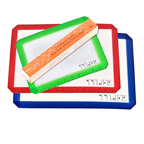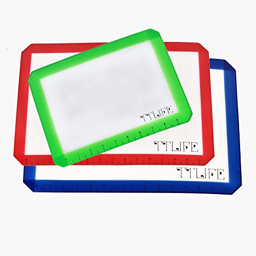 TTLIFE Silicone Non Stick Baking Mats with Measurements (3-Pack) - 2 Half Sheet Liners & 1 Quarter Sheet Mat - Professional Quality, Non Toxic & FDA Approved - Green, Red & Blue