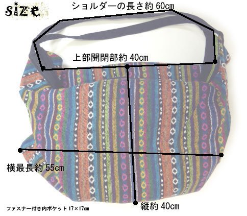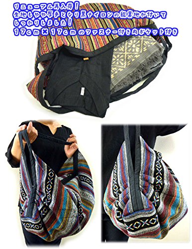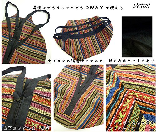 -. Feature : コットン 生地厚:厚手しっかり ナイロン総裏地 / リュックにもなる大容量2WAYゲリコットンショルダーバッグ。カラフル,エスニックな浮織模様がとってもエスニック。 / 肩からかけてもよし、リュックにもなり2WAYで使えます。 ざっくりと収納でき、膨らむと俵型のように丸くなります。 / 上部のファスナー付き開閉部は幅いっぱいまで開き、出し入れもしやすいです。 / アウトドア、フェス系コーデにもピッタリ!