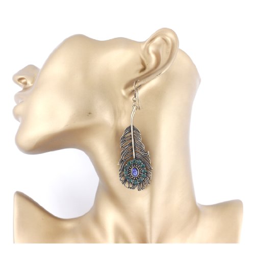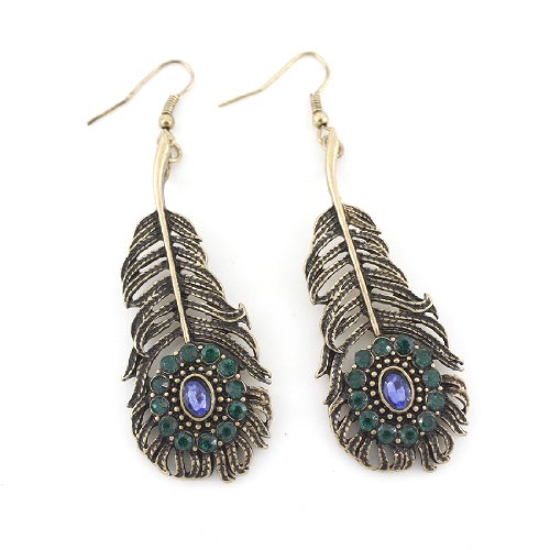 Gold Tone Green and Blue Crystal Feather Dangle Drop Earrings