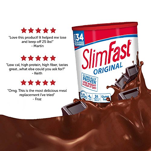Serving canisters of Slimfast 3 2 1 Plan Chocolate Royale Shake Mix