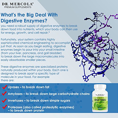 Dr Mercola Full Spectrum Enzymes is a safe and natural way to give your body's digestive enzymes the extra support they need to cope with a varied diet. This vegetarian-friendly digestive supplement contains a proprietary blend of full spectrum enzymes at a higher concentration than similar products available on the market. This makes Dr Mercola Full Spectrum Enzymes highly effective at giving your body's enzymes the extra support they need to break down fats, proteins and carbohydrates. Not only does this safe and natural digestive enzyme complex aid in relieving common digestive ailments like bloating, gas and general intestinal discomfort, it may also help you to derive more nutritional value from your food. Best of all, this potent digestive aid is perfect for non-meat eaters or those who prefer to purchase vegetarian supplements for ethical and health reasons. Dr Mercola Full Spectrum Enzymes make it easy to get your digestive system back on track; simply take one capsule daily before your biggest meal. For extra effective disgestive support this natural digestive aid can safely be taken 3 times daily; one capsule prior to each main meal. Even if you follow a strictly vegetarian diet and don't eat meat-based proteins, your body may occasionaly need help processing long-chain carbohydrates. These are found in foods like legumes, beans and quinoa as well as in fats, fibers and some dairy products. So if you suffer from occasional bouts of indigestion or you just want to give your body's digestive enzymes a boost and derive more nutritional value from your food, then be sure to make Dr Mercola Full Spectru Enzymes one of your daily must-have dietary supplements. 0 |