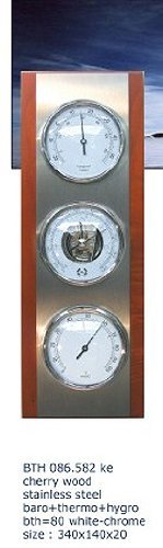 -. Feature : Cherry Wood Trim / Stainless Steel Center / White Dials - Made in Belgium / Temp. Range: -5F to 130F ( -20C to 54C ) / Hygrometer Range: 0% to 100% RH / Barometer Range: 28.3" to 31.7" hg - Altitude elevation 0 ft to 3000 ft / Frame measures 13 1/4" L x 5 1/4" W. Dials are 3" diameter.