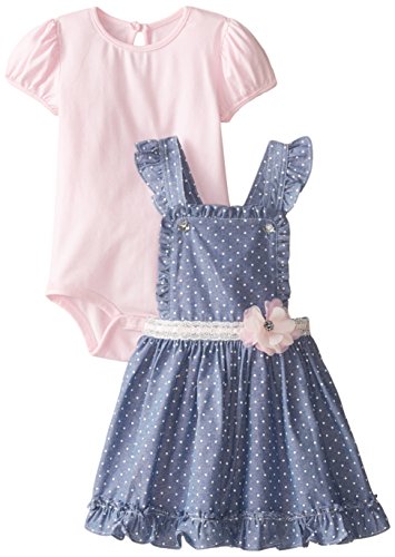 2 piece knit creeper and dress. Dress is polka dotted and has a lace trim with a tacked on satin flower and ruffled bottom