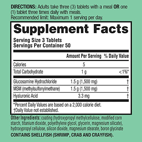 3 coated tablets provides 1500mg of Glucosamine, 1500mg of MSM and 3.3mg of Hyaluronic Acid