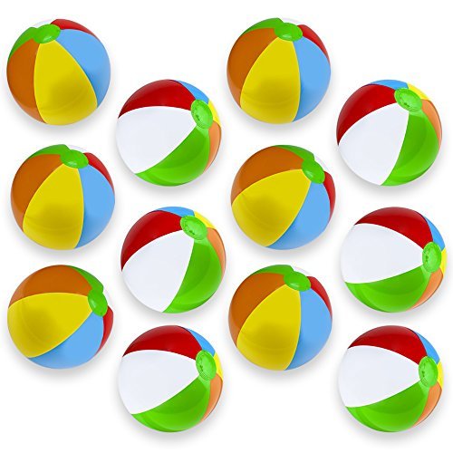 Studio : INI Publisher : INI Binding : Toy Product Description The indispensable beach accessory! Lay out your towel, plant the umbrella, breathe in the ocean air, and feel the sand crunch between your toes. The only thing missing from this picture? The beach ball! The perfect seaside toys since their invention in 1938, beach balls were originally about the size of a hand, but we've pumped up the size and pumped up the fun with our jumbo, six-color beach balls. Why You'll Love It: Our 12" beach balls are made with tough, durable vinyl with reinforced seams that stand up to a whole summer of play. Just pop out the valve, blow up the ball, and tuck the valve right back in! Each ball arrives deflated and unstretched. After your first inflation, allow the vinyl to expand, then top it off. The ball will hold a single inflation for weeks! Our beach balls are measured from pole to pole after inflation. Set of 12 balls per order! 0
