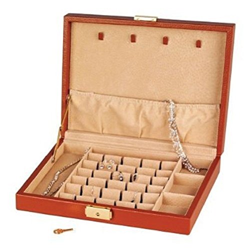- leather Cufflink box Four extra divided sections Holds ten pair of cufflinks Pocket to hold bracelets Hook on roof for necklaces