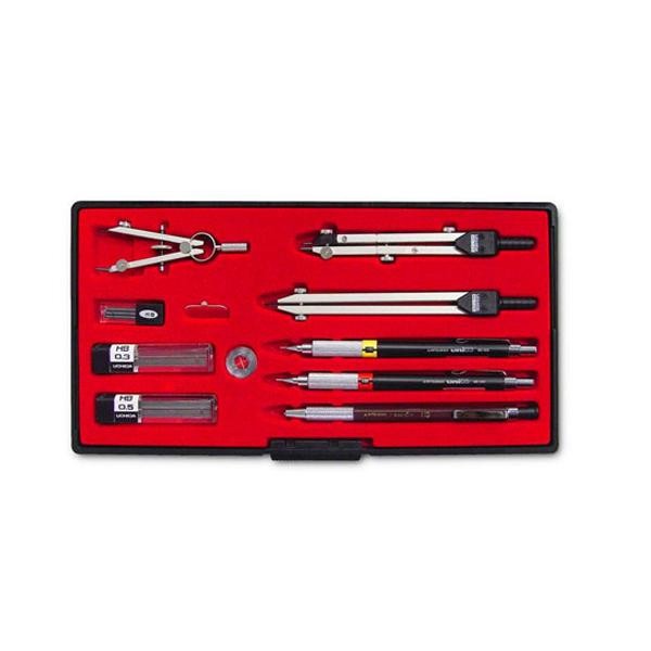| セット内容 | 小型穂替コンパス(鉛筆)、大型デバイダー、小型スプリングコンパス(鉛筆)、ドローイングシャープ(0.5mm/0.3mm)、ユニホルダー(2.0mm)、ホンセンター/ドライバー、芯入(2.0mm/0.5mm/0.3mm)、分度器12cm、字消板、拭布、ケース |