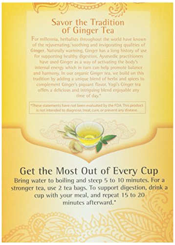 For millennia, herbalists throughout the world have known of the healing, soothing and invigorating qualities of ginger, considered the universal medicine. Naturally warming, ginger supports healthy digestion. Ayurvedic practitioners have used ginger as a way of activating the body¿s internal energy to help regain balance and harmony.* In our organic ginger tea, we build on this therapeutic tradition by adding a unique blend of herbs and spices to complement ginger's piquant flavor. Yogi's Ginger tea tastes delicious and offers the highest quality of a timeless herb.