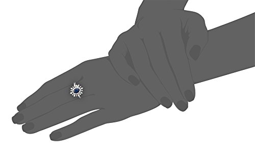 14k white gold ring in sunburst silhouette featuring oval-shape sapphire in halo of diamonds of various shape