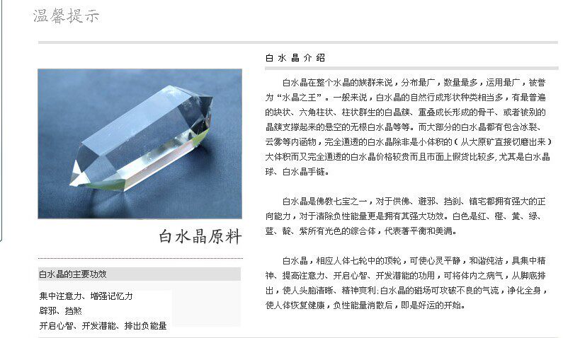 The white crystal is all color complex represents the balance for successful.Pray wishing the best effect also can be used as amulets peace symboluse. But can increase the human energy enhanced vision improve theFeng Shui. Electromagnetic wave absorbing effect is the best. The white crystal can increase the stress concentration enhance memory the most suitable candidates wear. White crystal provides spiritual power the mentality and spiritual development of great help. That has increasedmemory and concentration in fact, because the white crystal spirit spiritualpower against the material world so it is concentrated to help thinking not to be deceived by the external images.