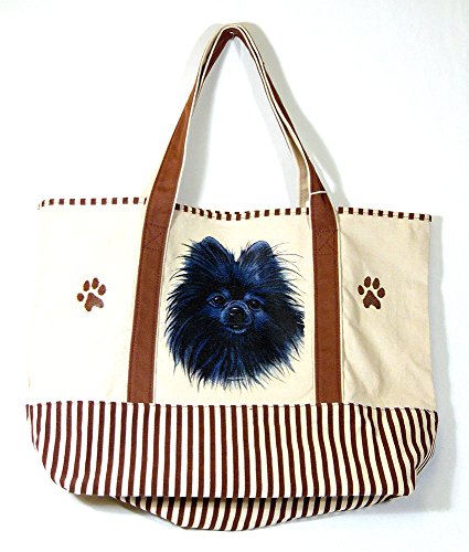 Product Description Attractive and roomy, this trendy cotton canvas tote is the perfect accessory for every girl about town. Natural color background; brown striped trim and bottom section. Tote's front is screen printed with two paw prints and Black Pomeranian illustration. 0