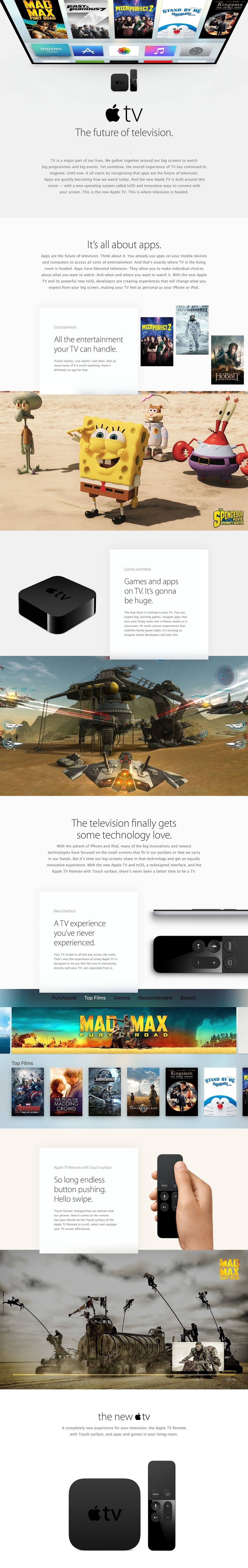 - Enjoy your favorite content from apps such as iTunes and more, all on the new Apple TV.