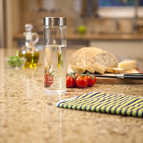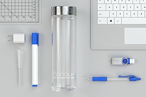 Boroux Glass Bottles are a non-toxic, BPA free, eco-friendly, and reusable alternative to plastic bottles. The Boroux Glass water bottle, like many great products, was inspired by a need. The need for a safe, sustainable and portable water storage solution. Made from pure borosilicate glass - a very clear glass which resists heat changes better than other types of glass. Boroux bottles are great for camping, the gym, working out, daily usage and even all types of essential oil consumption including doterra & young living. Additionally the thick bottom provides extra durability allowing Boroux glass bottles to be used repeatedly and even cleaned in the dishwasher! The Boroux Bottle's capacity is 500ml (16.9 oz), and is the perfect size for carrying daily. Refill four times a day for the recommend fluid intake of 64oz. The 2 5/8" diameter of the bottle fits nicely in your hand as well as most cup holders, allowing for easy transportation. The height of the bottle, from the bottom to the base of the cap, is 7 1/2", the cap is 7/8" tall for an overall height of 8 3/8". Finally the no leak lid allows for the bottle to be carried as needed without any unfortunate spills.Feature