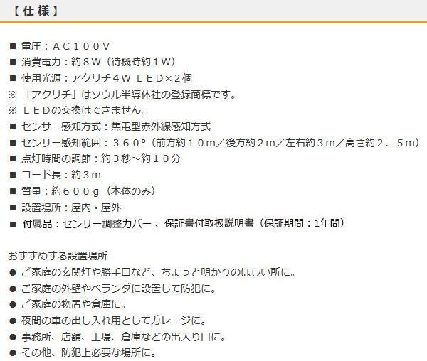 fk094igrjsLEDを使用したセンサーライトです360度感知センサーを搭載センサー範囲を狭くする「センサー調整カバー」も付属 サイズ 個装サイズ:18×13×17cm 重量 個装重量:600g 製造国 中国 人や車が近づくと点灯します ------ ココがポイント ------ ●LED(4W)を2個使用消費電力8Wと省エネです(待機時1W) LEDを使用したセンサーライトです360度感知センサーを搭載センサー範囲を狭くする「センサー調整カバー」も付属 ご注文後3~4営業日後の出荷となります