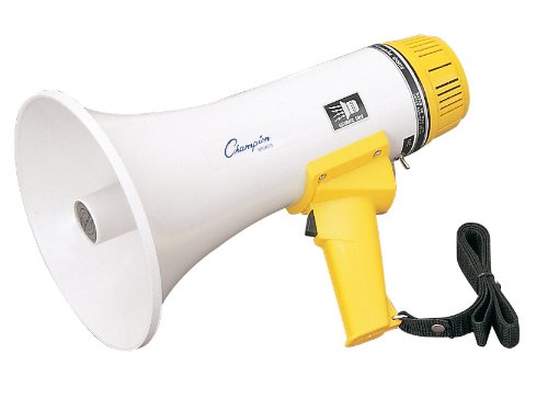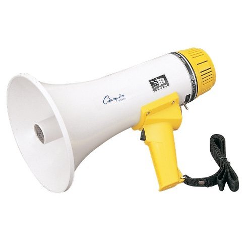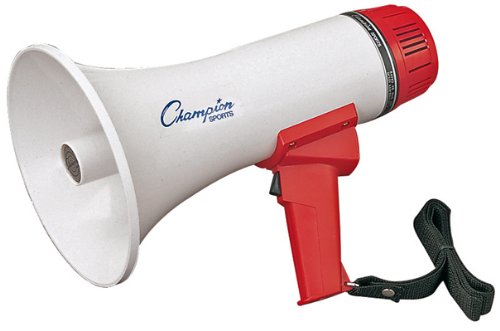 6 Watt Megaphone (600 Yard Range): This Champions Sports 6 to 10-watt megaphone offers an 600-yard range. It includes an adjustable volume control and a wrist strap. Requires 8 AA batteries (not included). 8 Watt Megaphone (800 Yard Range): This Champions Sports 8 to 12-watt megaphone offers an 800-yard range. It includes an adjustable volume control, a powerful siren and a wrist strap. Requires 8 AA batteries (not included). 12 Watt Megaphone (1000 Yard Range): This Champions Sports 12 to 25-watt megaphone offers a 1000-yard range. It includes an adjustable volume control, a powerful siren and a wrist strap. Requires 8 C batteries (not included). 0