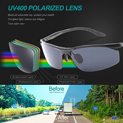 [ENHANDCED POLARIZED TAC LENS] - UV400 protection 100% blocks UVA & UVB Rays. Ultraviolet ray can burn our skin and UVB is harmful for our vision ability. Our polarized lenses could also block out intense horizontal reflections by having vertically oriented filter layer embedded, providing maximum comfort and improved visibility. No worry about glare light anymore! Lens and frames are impact, scratch resistant and durable.