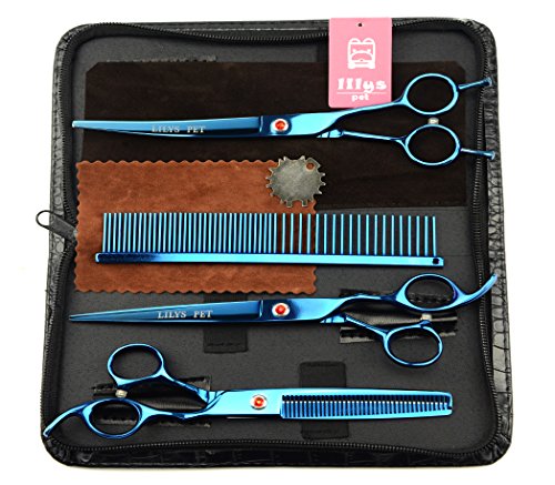 Parts list (1 set): 1 straight scissor, 1 thinning scissor, 1 Two-way curved scissor, 1 scissors' case, 1 brushing clothes,color is random, Size:7.0" Color:Blue. Material:6CR stainless steel Hardness:58HRC