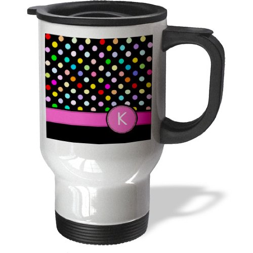 3dRose tm_154308_1 Letter K Monogrammed on Rainbow Polka Dots Pattern with Hot Pink Personal Initial Colorful Girly Stainless Steel Travel Mug, 14 oz, White