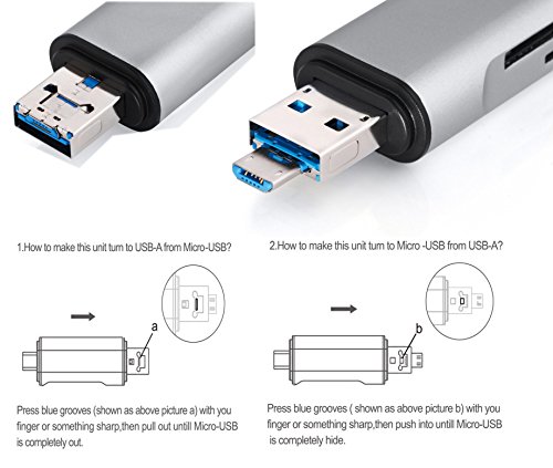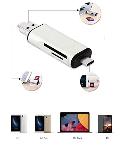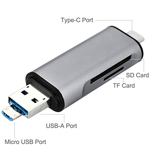 USB A & Micro USB & USB C Multiple Card Reader. Two slots for TF/SD memory card, a Type C male port for your latest USB C devices. A Micro USB port is for the Micro USB OTG supported smartphones. USB A 2.0 is for all devices with USB port.