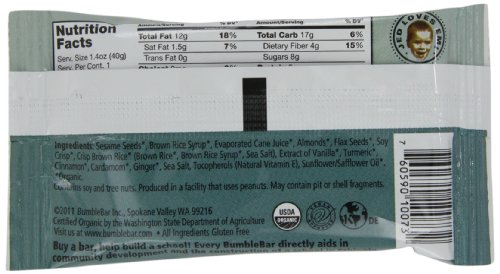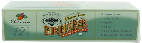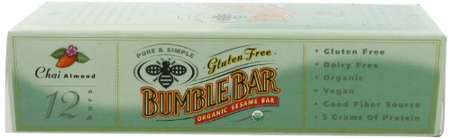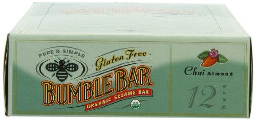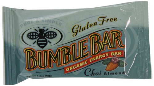 -. Binding : Grocery -. Brand : BumbleBar -. Color : chai w/almond -. EAN : 0760590041318 -. Feature : Pack of twelve, 1.4-Ounce (total of 16.8-Ounces) / Enhance the natural flavors / Strong antioxidant that fights free radicals; Rich in fiber / Helps to lower cholesterol and regulate blood sugar levels / BumbleBar was picked the best bar by Better Nutrition magazine; Made mostly from flax and sesame seeds, so they're naturally high in omega-3 fats; vegan and organic, they also come in junior sizes for kids -. Label : Bumble Bar -. Manufacturer : Bumble Bar -. Model : 0 -. MPN : mp-51682BUM1003000000 -. NumberOfItems : 1 -. PackageQuantity : 1 -. PartNumber : mp-51682BUM1003000000 -. ProductGroup : Grocery -. ProductTypeName : GROCERY -. PublicationDate : 2011-04-09 -. Publisher : Bumble Bar -. Size : 12 bars -. Studio : Bumble Bar -. Title : BumbleBar Gluten Free Organic Energy Chai with Almonds, 1.4-Ounce Bars (Pack of 12) -. UPC : 760590041318