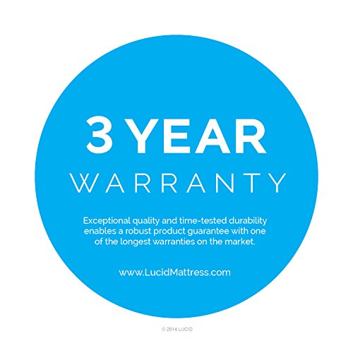 - Warranty : 25-Year limited warranty guarantees that your Lucid mattress will be replaced, repaired or refunded at our discretion if it is deemed defective due to faulty workmanship or structural defects. The warranty does not cover normal changes in softness or resilience that do not affect the performance of the mattress. Small body impressions less than 1.5 inches are normal and not covered under the warranty. The warranty applies only to the original purchaser. Abuse, stains on the cover or mattress, or platform or box foundation support will void any warranty. Lucid shall not be liable for any consequential losses arising from the purchase, installation and/or use of this product. For complete warranty information go to Lucidmattress.com READ BEFORE OPENING: Carefully remove plastic packaging being careful not to cut through to the mattress. Place compressed mattress on a flat surface in a well-ventilated room and allow 48 hours for expansion. Due to the unique properties of memory foam, dimensions after expansion will vary; this is normal and will not affect the performance of your new mattress. New memory foam may initially have a slight odor; it is completely harmless and will dissipate over a short time with regular use.