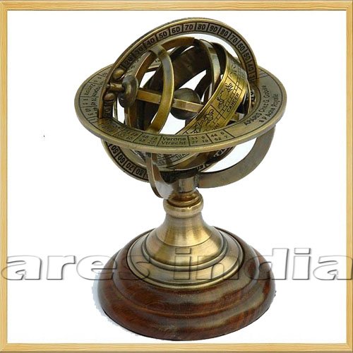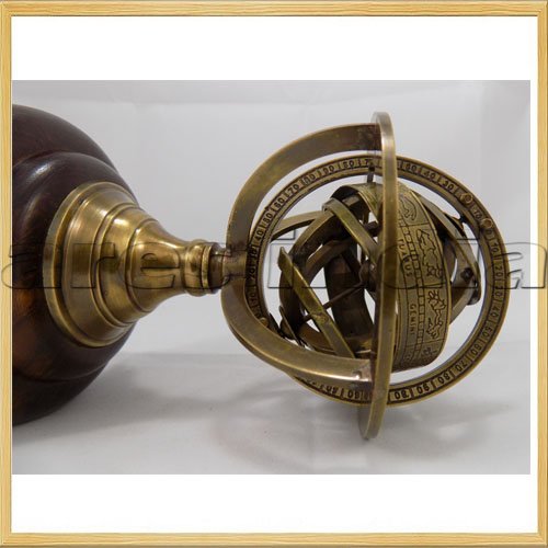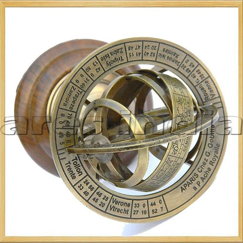 1- brass armillary sphere globe 5.5" on a beautiful rosewood base. ; 2- it was used extensively as a teaching tool to explain the functioning of the solar system in greek antiquity.