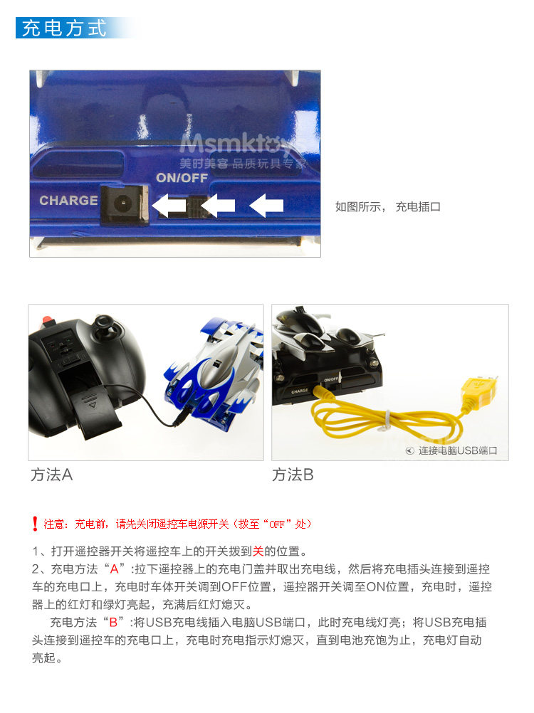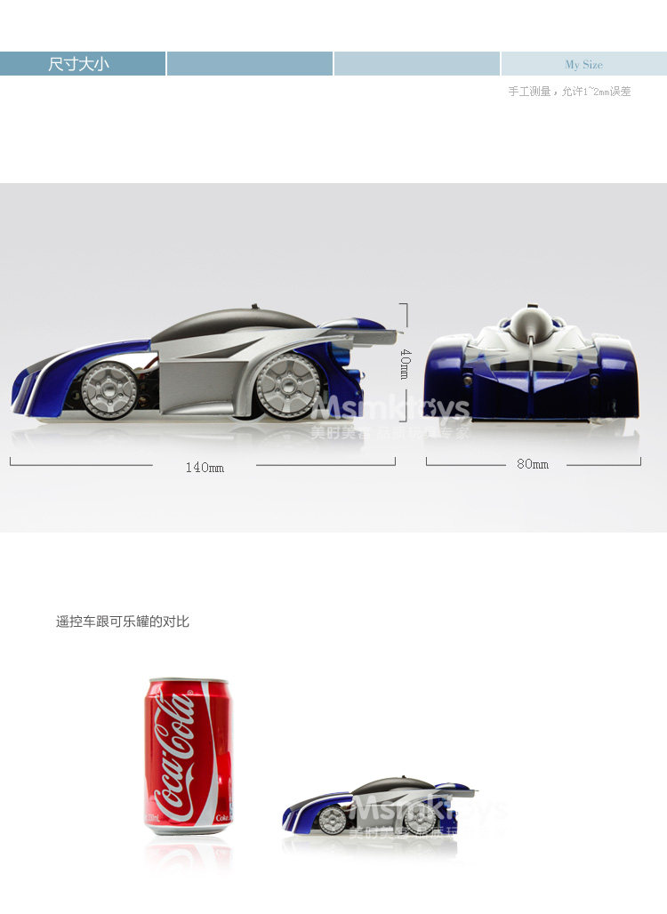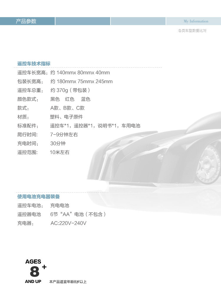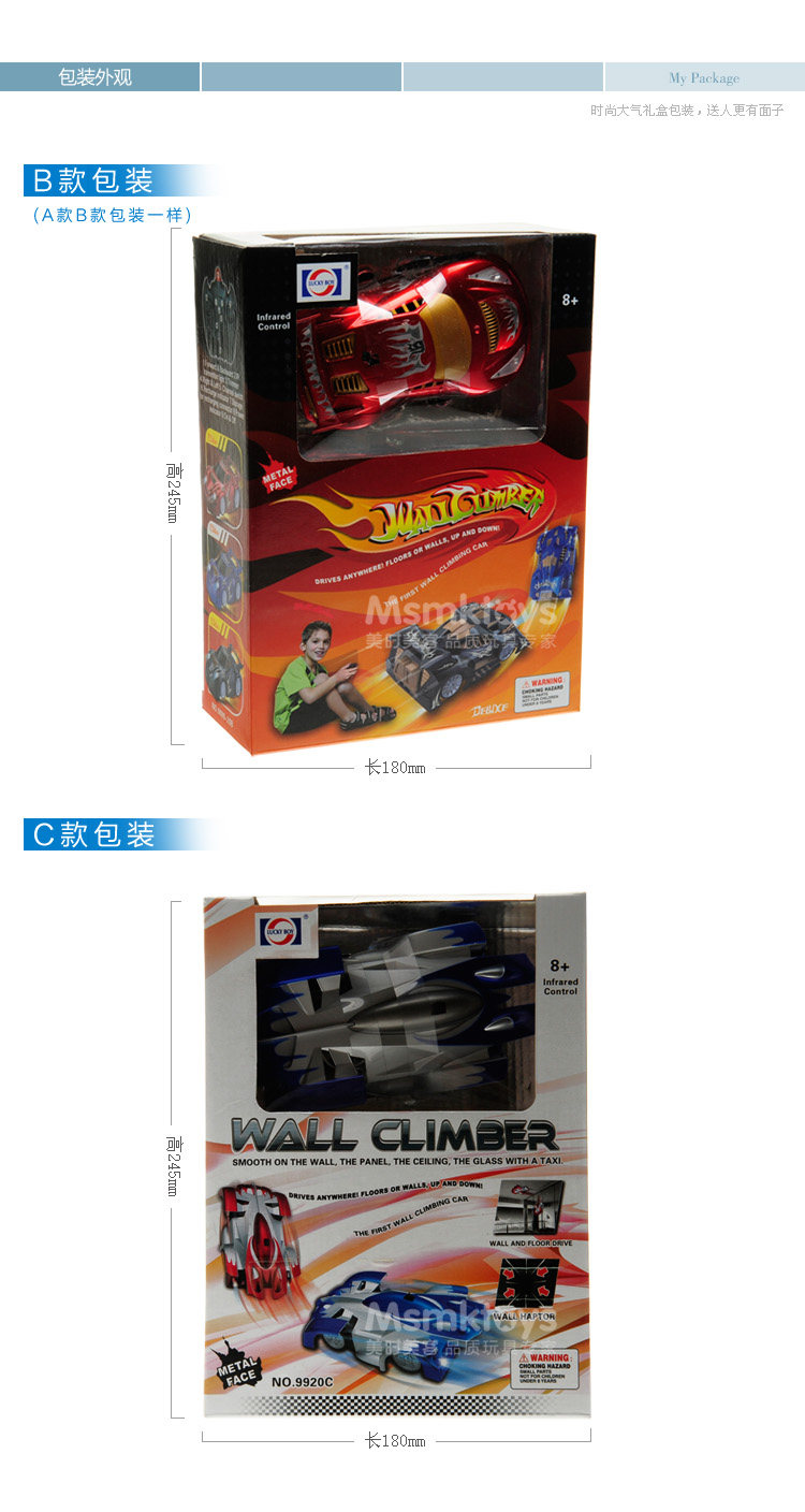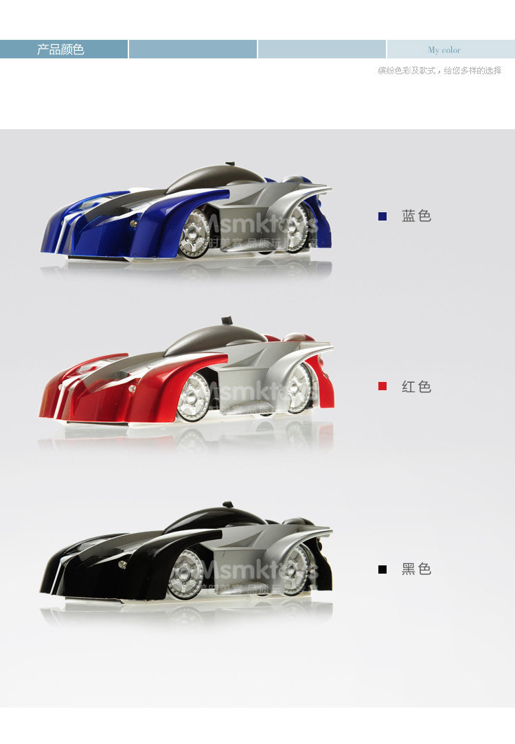 ABC三款爬墙车各有三种颜色:红色、黑色、蓝色,三款性能一样,外观样式略有不同,