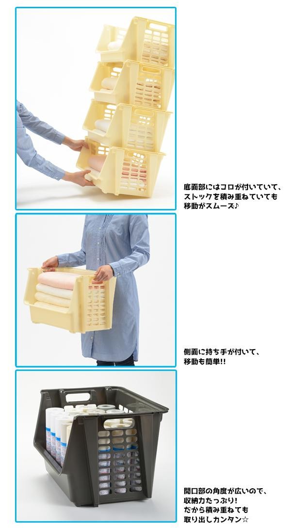 様々な収納が出来る収納ケースです。側面部には持ち手・底面部はコロ付で移動が楽な上、開口部の角度が広いので収納力たっぷり♪連結部はツメになっているので、パチっとはまって安定します。一度はめ込んでも取り外し可能!!浅型と深型で高さ調節ができます♪ |