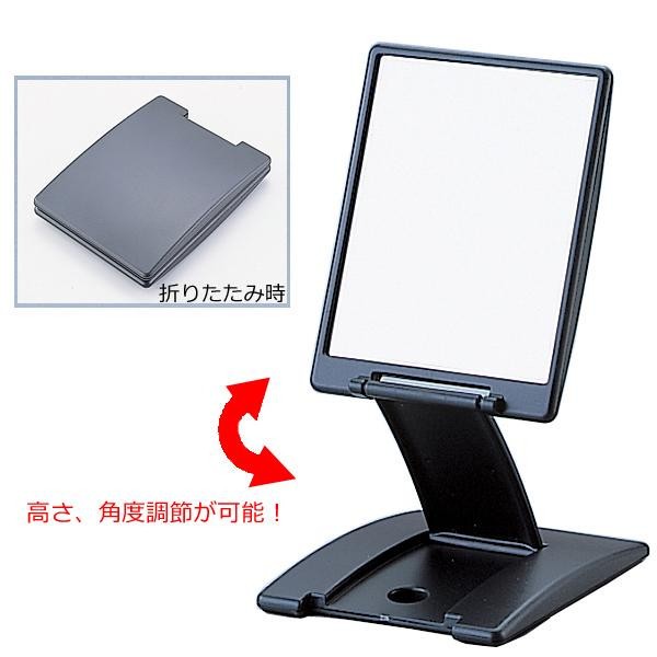 コンパクトに折りたたむことができるので持ち運びにも便利!! 製造国:日本 素材・材質:ABS樹脂・ガラス鏡 商品サイズ:本体:幅128×奥行170×高さ31mm(折りたたみ時)、鏡面:116×145mm 重量:270g 仕様:完成品折りたたみ可高さ調節可(約190~300mm) ※サプライヤー直送品 ご注文後7~8営業日後の出荷となります【商品名】プロポーズ スタンドミラー Y-1800 ブラック