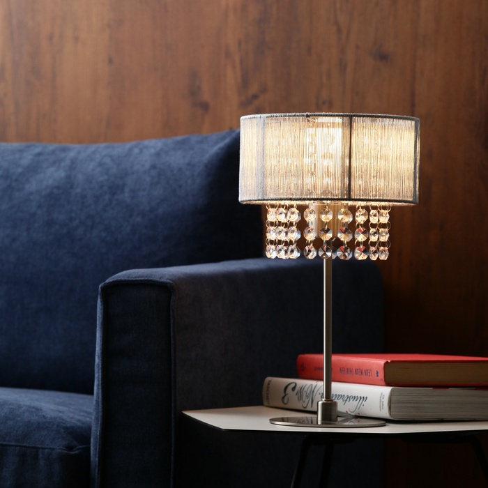 라메감이 있는 스트링 소재의 쉐이드를 사용한 테이블 램프입니다.아크릴은 아니고 수정 유리를 매닮이다 듯한 모양이고 있으므로 빛의 반사가 아름답고,밤은 방을 한층 더 고저스(gorgeous)에 연출해 줍니다.소파나 베드의 싸이드,보드 위에 좌우 대칭으로 두어 주면 보다 분위기가 나옵니다.