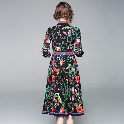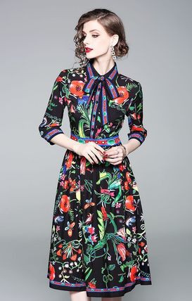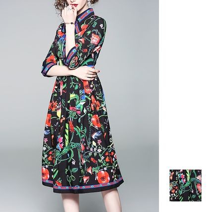 ワンピース ミモレ丈 パーティードレス レトロ 花柄 七分袖 シャツワンピース ウエストマーク 大人 上品 エレガント お呼ばれ drgz3022