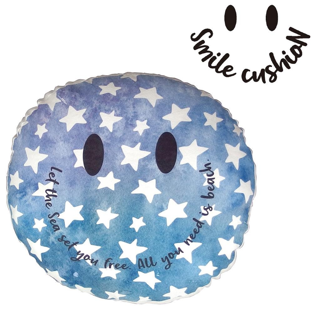 スマイルと星柄が一緒になったクッションです。カバーの取り外しはできません。