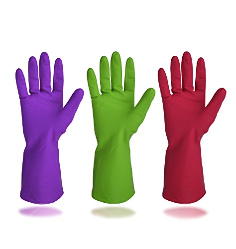 -. Feature : 3 Colors: Light weight and bright color, easy to distinguish. / There is no noxious smell like some other brands of gloves, they feel smooth in the inside and have a nice grip. / They do a great job of keeping your hands dry, they are not skin tight your hands so it makes it easy to take them on and off. / These gloves will make it possible for you that is allergic to the combination of the water and natural liquid detergent to hand wash the dishes that are not dishwasher safe. / Perfect for household cleaning, dishwashing, gardening, car washing and pet care use.