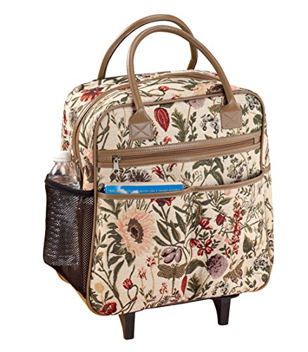 -. Feature : Very roomy yet narrow carry on travel bag / Rolling carry on features mesh side pocket (perfect for umbrella), 2 front pockets, zippered front compartment, roomy interior with zippered closure and 2 wheels / Includes 2 carry handles and telescoping handle / Beautiful tapestry floral pattern