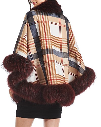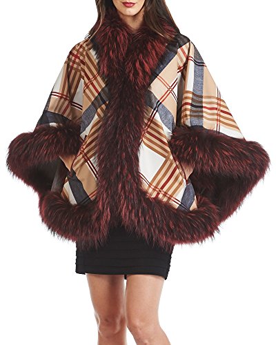 Binding : Apparel Product Description A funky print makes our Plaid Nylon Cape with Dyed Finn Raccoon Trim stand out in a crowd. Snap button closures on the arms create warm sleeves while two front pockets on the body keep your items safely tucked away. The draping style is accented with a cozy fleece interior and the one-size-fits-all effect flatters any figure. 0