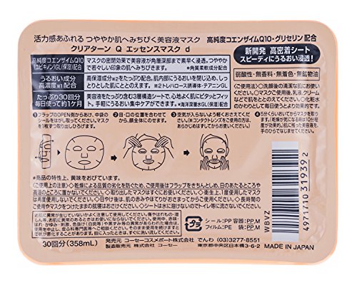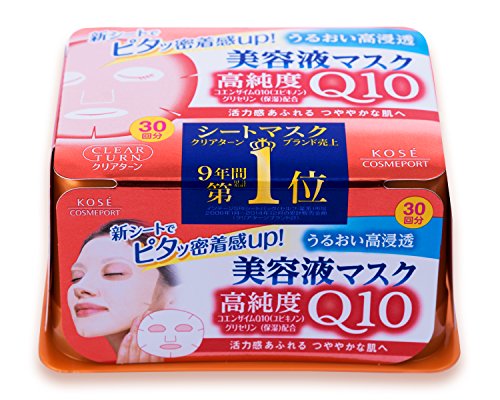 -. Binding : Health and Beauty -. Brand : CLEAR TURN -. Department : Beauty -. EAN : 0701315121366 -. Feature : Uses deep ocean water to hydrate skin and keep skin soft. / Weakly acidic, no fragrance, no colorant, and no alcohol. . / Made in Japan, comes with English usage instructions and ingredients. -. IsAdultProduct : 0 -. Label : KOSE -. Manufacturer : KOSE -. Model : CP -. MPN : 4971710319392 -. NumberOfItems : 1 -. PackageQuantity : 1 -. PartNumber : 4971710319392 -. ProductGroup : Beauty -. ProductTypeName : HEALTH_PERSONAL_CARE -. Publisher : KOSE -. Studio : KOSE -. Title : Kose Clear Turn Essence Facial Mask with CoQ10 and Glycerin - 30 masks -. UPC : 890303309104