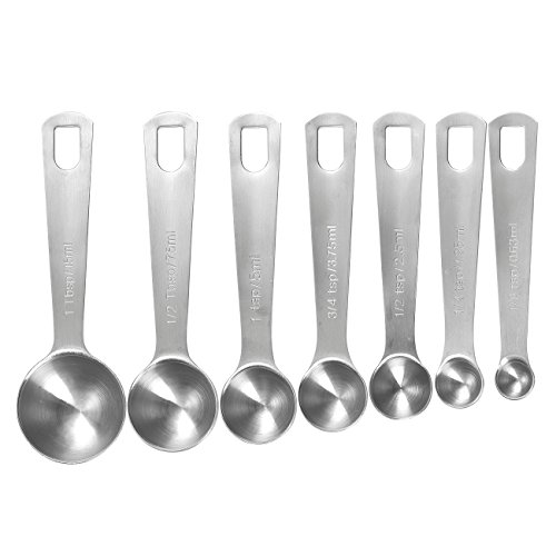 Studio : Juvale Publisher : Juvale Product Description This 7-Piece Stainless Steel Measuring Spoon Set has all the sizes you need, ranging from 1/8 tsp to 1 Tbsp. It's extremely durable due to its stainless steel construction. It is rust resistant, food grade, non-toxic and corrosion resistant. Handy loose-leaf ring lets you hang these measuring spoons up to save space and for easy accessibility and you can easily remove individual spoons as well. Size markings are engraved in both Metric and Imperial measurements. Contains measuring spoons of the following sizes: 1/8-tsp (0.63ml) 1/4-tsp (1.25ml), 1/2-tsp (2.5ml), 3/4-tsp (3.75ml), 1-tsp (5ml), 1/2-Tbsp (7.5ml), 1-Tbsp (15ml). Handles vary from 4.2 to 5 inches in length. 0