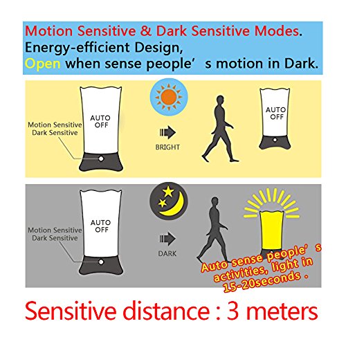 SENSITIVE MOTION SENSOR:PIR Motion sensor picks up your movement at a distance < 6feet. Auto turn on when motion is detected in dark area.Auto turn off within 25 seconds when no motion is detected.
