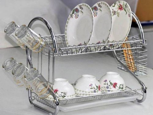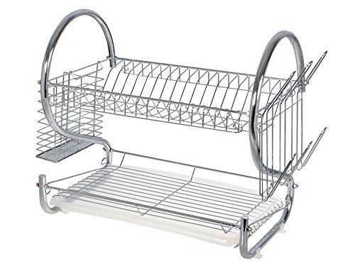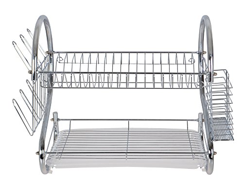 2 layer dish rack holds up to 17 plates or bowls Removable Side mounting mug stand and cutlery holder Constructed with heavy duty and rust-resistant chromed wire for stability and durability Lower flat surface accommodates glasses or mugs Removable draining tray allows easy removal of excess water Non-marring silicone coated feet protectors Assembles in minutes Package Includes: plastic draining tray, mug stand, and cutlery holder Dimensions (W x H x L in inches): 21 x 15 1/4 x 9 1/2