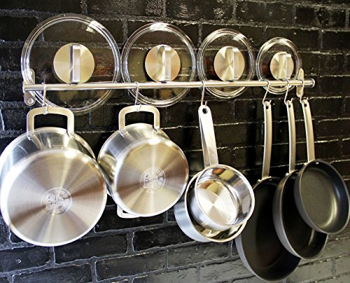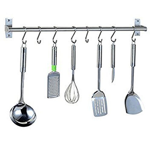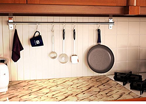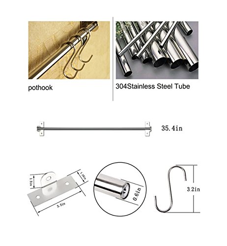 - HIGH EFFICIENCY AND USABILITY: The kicthen pot rack is placed on the wall and not occupy many space. Include a 35-inch rail and 5 S-shape hooks. Work to hang spatula,pan,saucepan,ladle and more. Save more space for kitchen counterto and utensil cupboard. Very suitable for the fimily which has lots of cooking utensils.