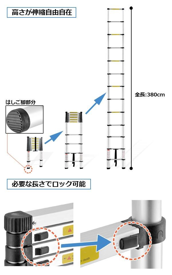| 2階の窓、外壁などの掃除や電球交換に最適です。高さが伸縮自由自在で、必要な長さでロック可能。収納時には高さ86cmになるので、とってもコンパクト!! |