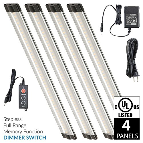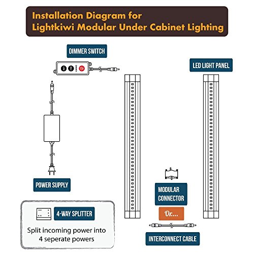 - Includes: (4) 12 inch Warm White 3000K Modular LED Under Cabinet Lighting Panel, 12 Watt Power Supply - Link up to (4) 12 inch LED Light Panel, Dimmer Switch, 4-Way Splitter, (4) 3ft Interconnect Cable, (4) Modular Connector, and (8) Mounting Screws.