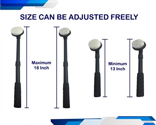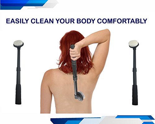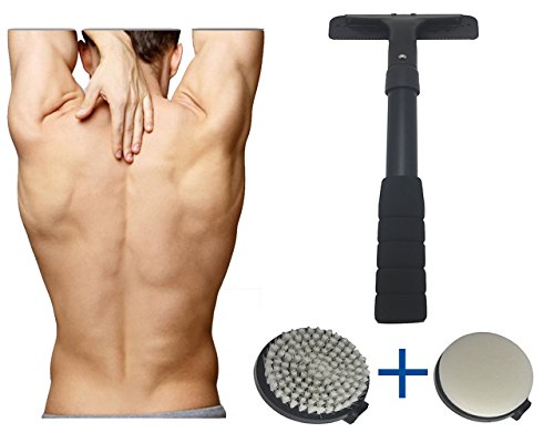 - TWO MORE HEADS INCLUDED (BATH & SHOWER BODY BRUSH + BATH & SHOWER BODY SPONGE): All you need to do is interchange the heads according to your needs. Bath brush and sponge can be used for cleaning your body parts such as the neck, shoulder, back, the backs of your legs and other tricky spots. Easily scrub your back in the tub or shower without any hassle. Improve your skin's quality and leave it feeling softer and smoother. Use with your favorite body wash or scrubs to clean and remove dead skin.