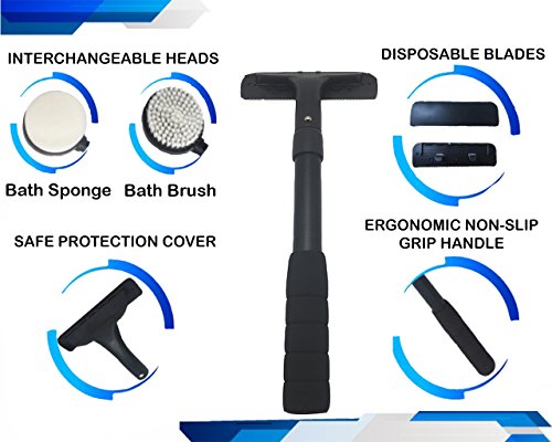 - EASY TO USE, MAINTAIN & CLEAN: This set is sturdy enough to use daily. Includes safety stainless-steel disposable blades to reduce the risk of injuries or shaving-induced cuts. You can shave your back & body with the choice of doing so wet or dry. It will not slip from your wet hands by accident because there is a non-slip band wrapped around the handle that will offer you a better grip during your shower. Set is hygienic and fully washable. Just rinse it after use and hang it up for air drying.