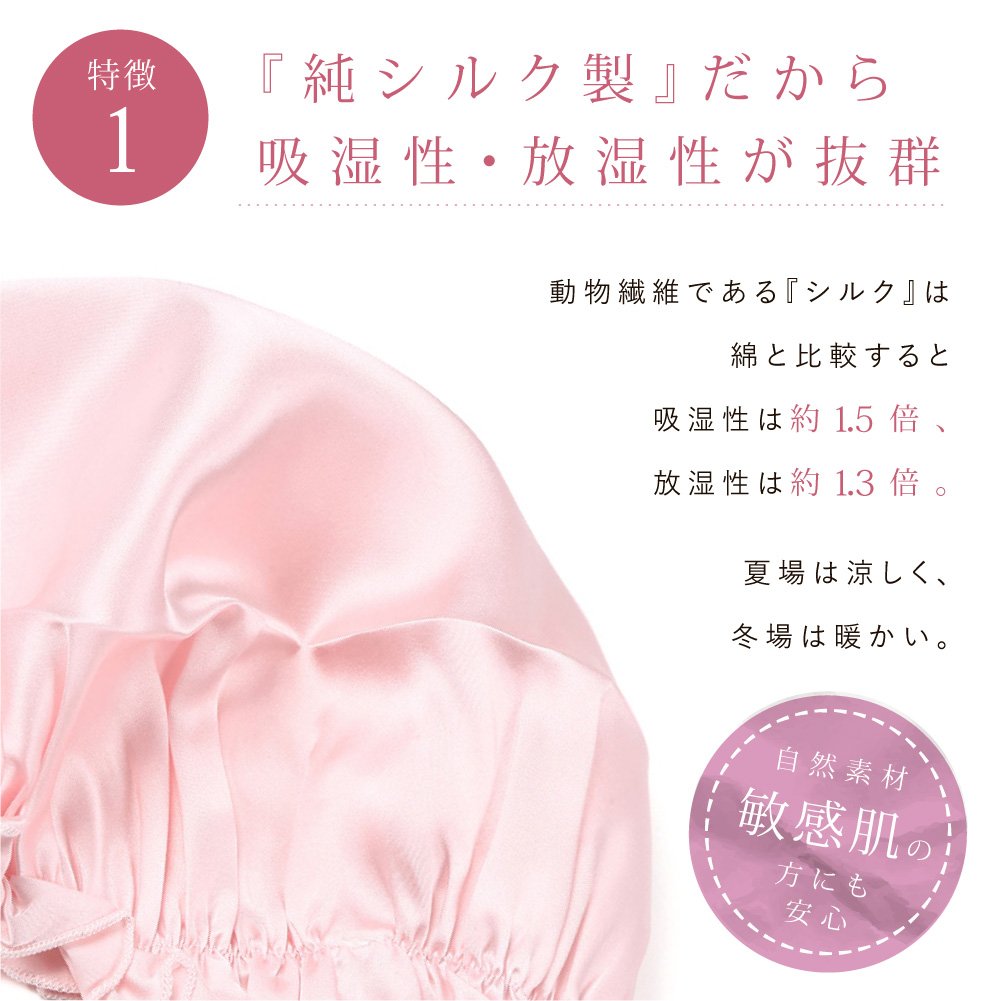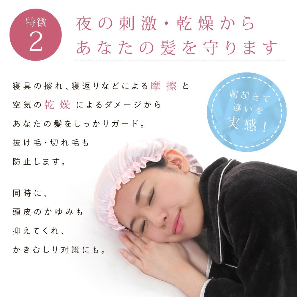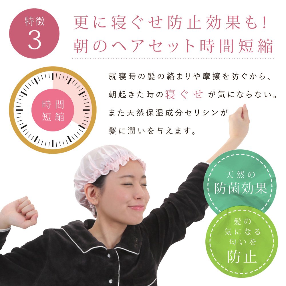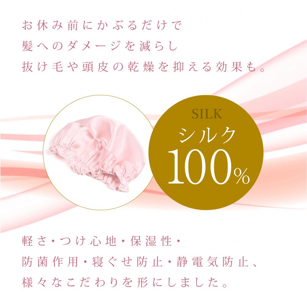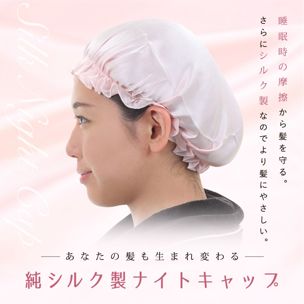 Silk made nightcap which gives moisture and gloss.