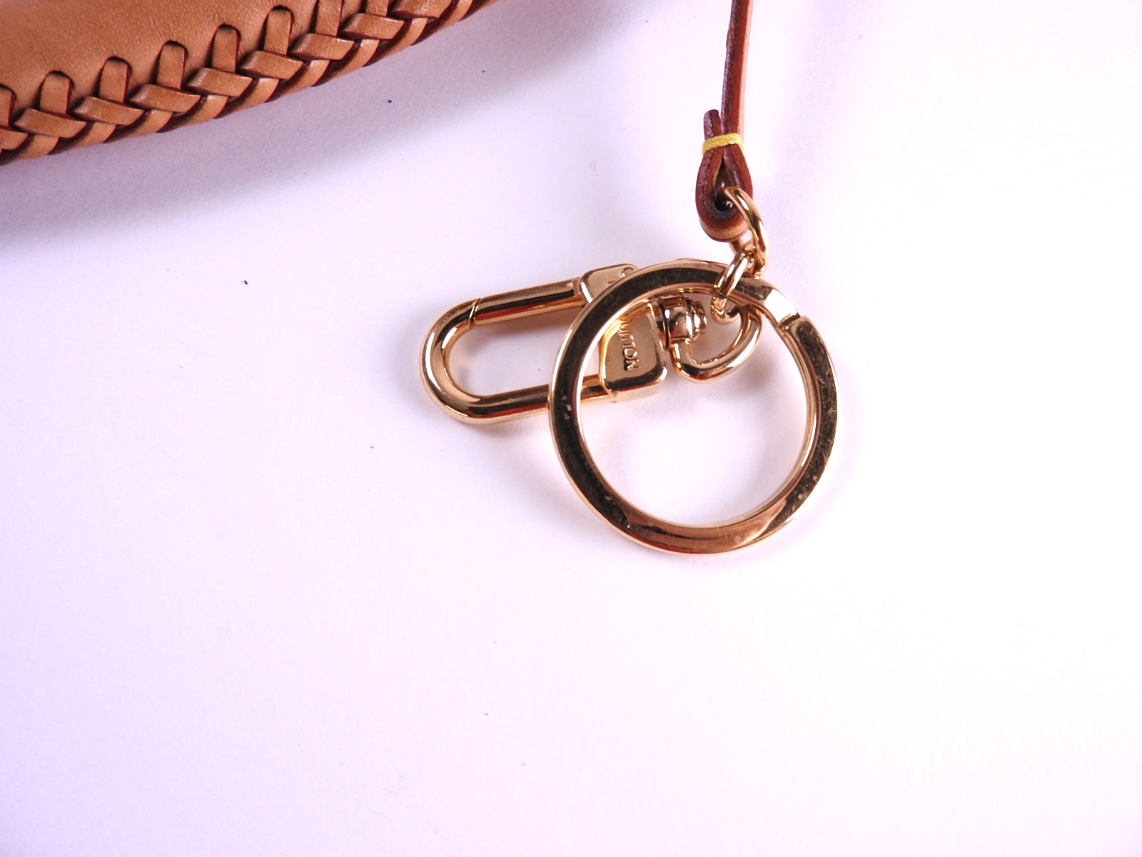| Snaps、Zippers and Hardware | Slightly used feeling. Small scratches and stains. The key ring charm has a few small cracks in the leather part as No.13 photo. |