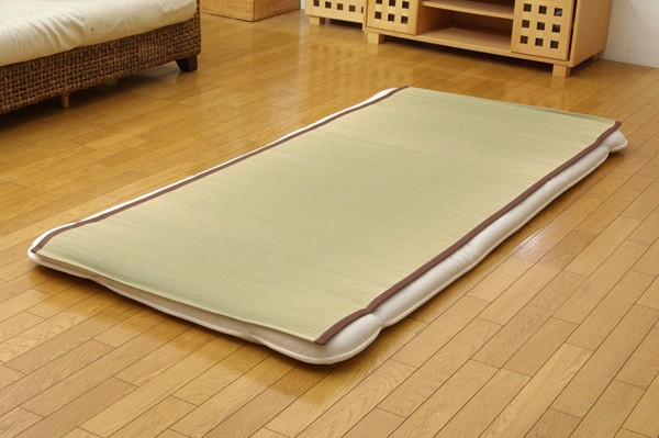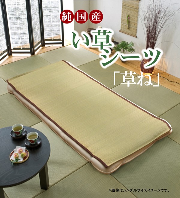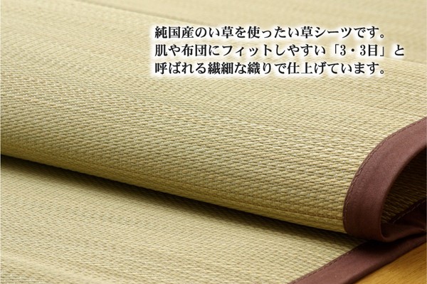 国産(九州産)のい草を使用した敷きパッドです。一本一本が太く、表皮が厚く繊維がキメ細かいので、弾力性があり、耐久性に優れています。い草には1.綿の約3倍の吸湿性があり汗のじめじめを軽減します。2.湿度の調整作用があり、蒸れにくく快適な就寝を促します。3.汗のにおいの元となる化学物質を90%以上抑え、においを軽減します。などの効果があります。また、無染土のい草を使用しておりますので柔らかく、すべすべとして身体にフィットします。い草に青森ヒバ加工を施しています。(抗菌、防臭効果)