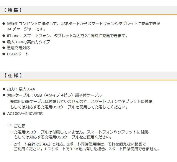 fk094igrjsご家庭のコンセントで使える、ACチャージャーですUSBポートからスマートフォンやタブレット等を2台同時に充電できますサイズ個装サイズ:8×18×4cm重量個装重量:250g製造国中国スマートフォン等を2台同時に充電できるACチャージャー!!ご家庭のコンセントで使える、ACチャージャーですUSBポートからスマートフォンやタブレット等を2台同時に充電できます